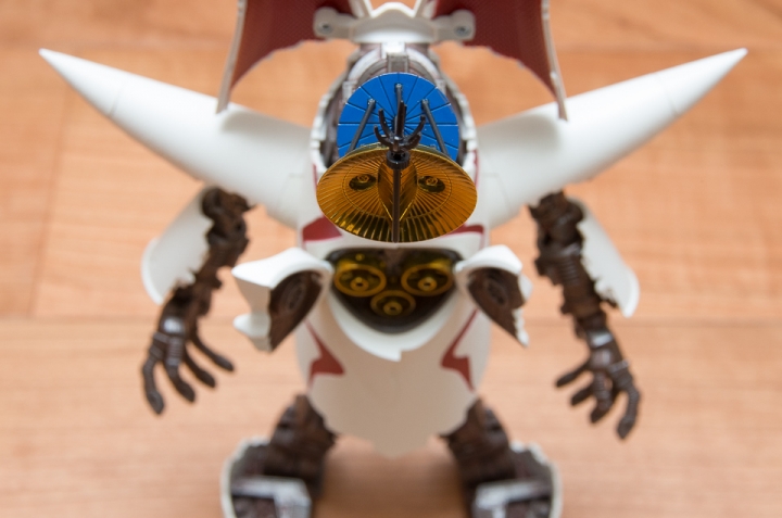 これにて武装展開も終わり、「太陽の塔のロボ」は最終形態到達。あとは台座に乗せてみたり動かしたりと、ひとしきり遊んで我が家のインテリアの1つとなった。