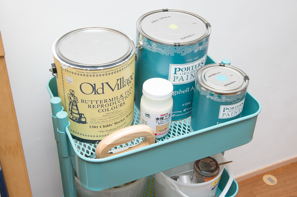 さあ出来た!当初工具入れの予定だったけれど、床にリフォームに使っているペンキ缶やらパテやらを転がしたままだったので、それらを入れてみた。