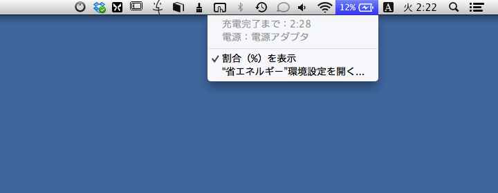 どうも近頃MacBook Airのバッテリーの減りが最近随分速くなっている。正味2時間持つかどうか。まだ使えなくはないけど…と思って普段あまり意識していないメニューバーのバッテリーアイコンをクリックしてみたら、「バッテリーの交換修理」と言うメッセージが表示されていた。これはなんとなくやばそう。
